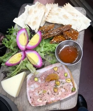 Brewers Board - Olympia Provisions Chorizo Rioja, Tillamook smoked cheddar, house pickled bread & butter pickles, marcona almonds, fresh baked ale bread, and our cilantro-mustard sauce. $13.99